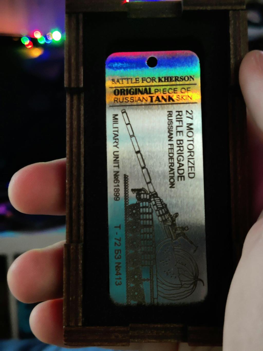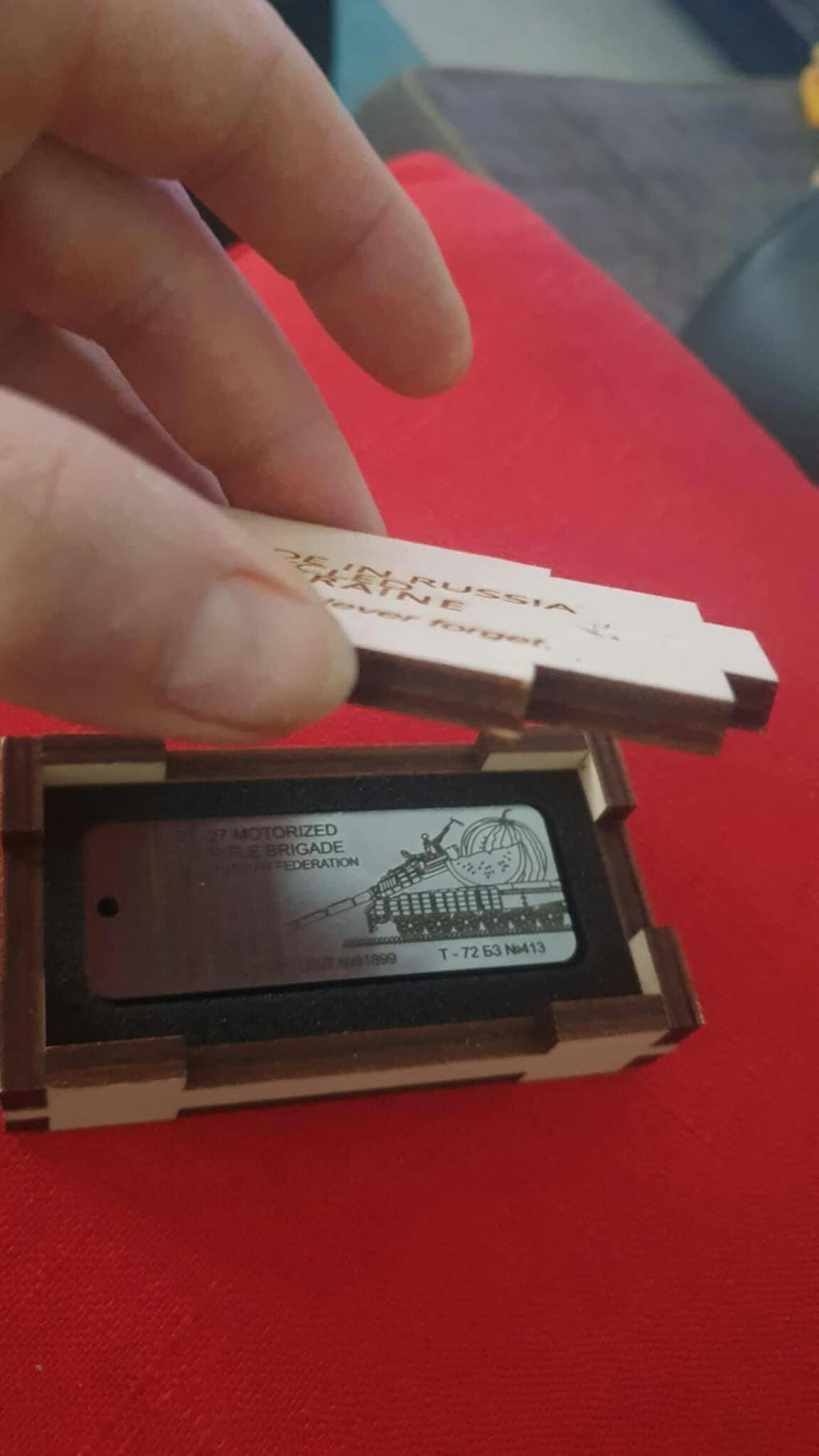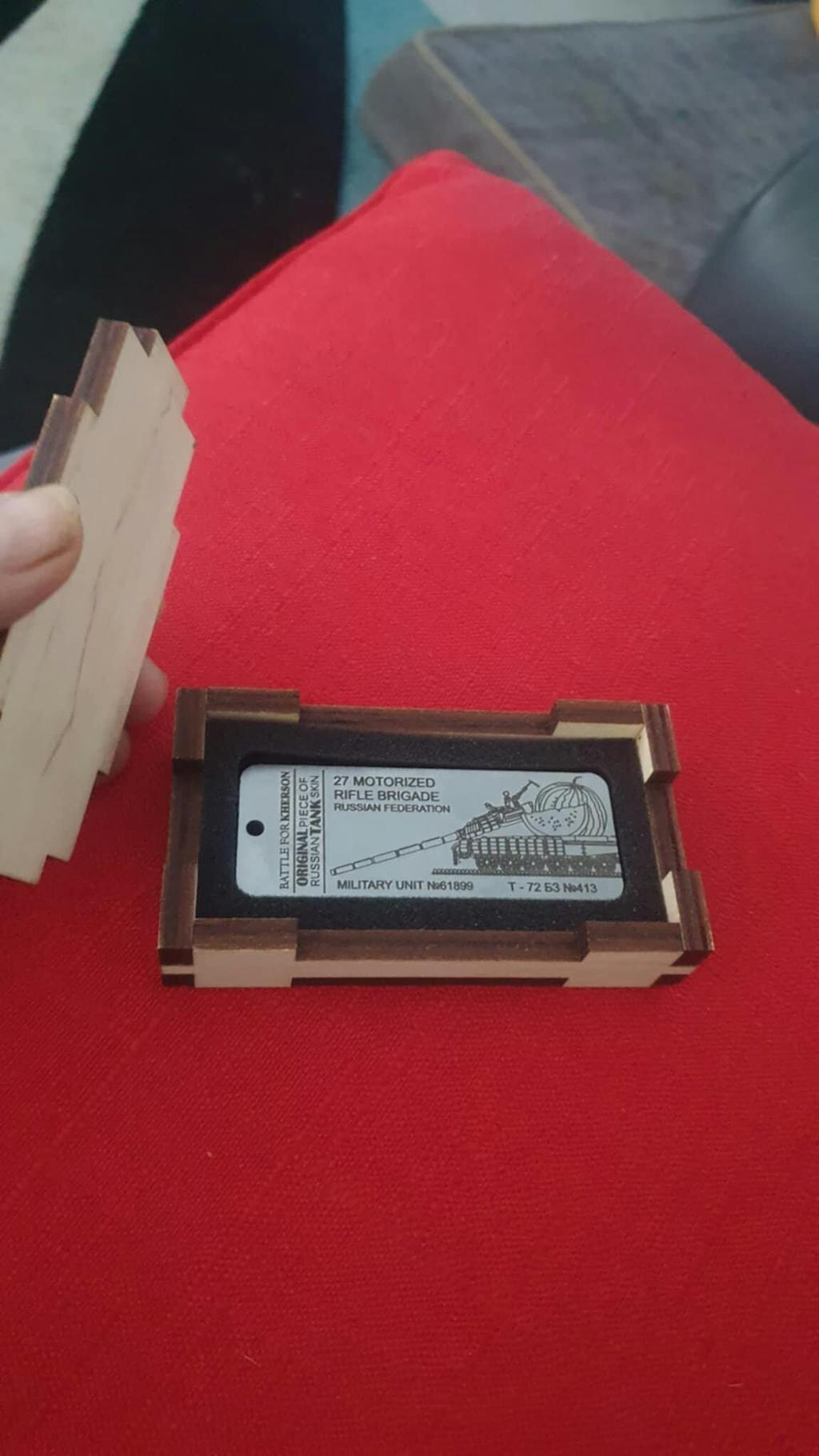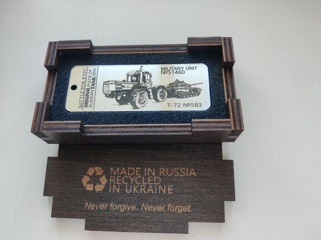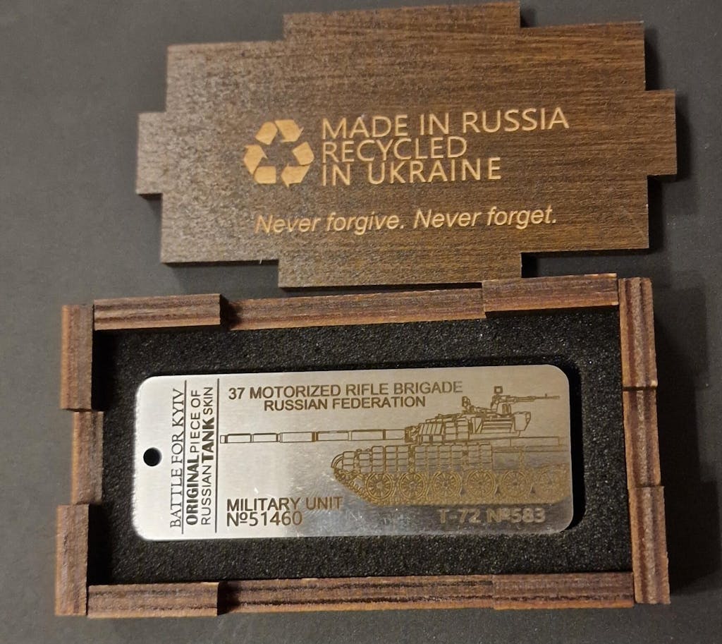 Excellent product. The box is very well made with a nice dark finish in my case. The piece is amazing and has a bit of weight to it, you can really tell its tank armour. The engraving is also really well done (its darker in real life compared to the photos). It does have a rough finish to it but it adds to the feeling that a Russian tank was ripped apart for it. 10/10 already bought another. SLAVA UKRAINI!!!