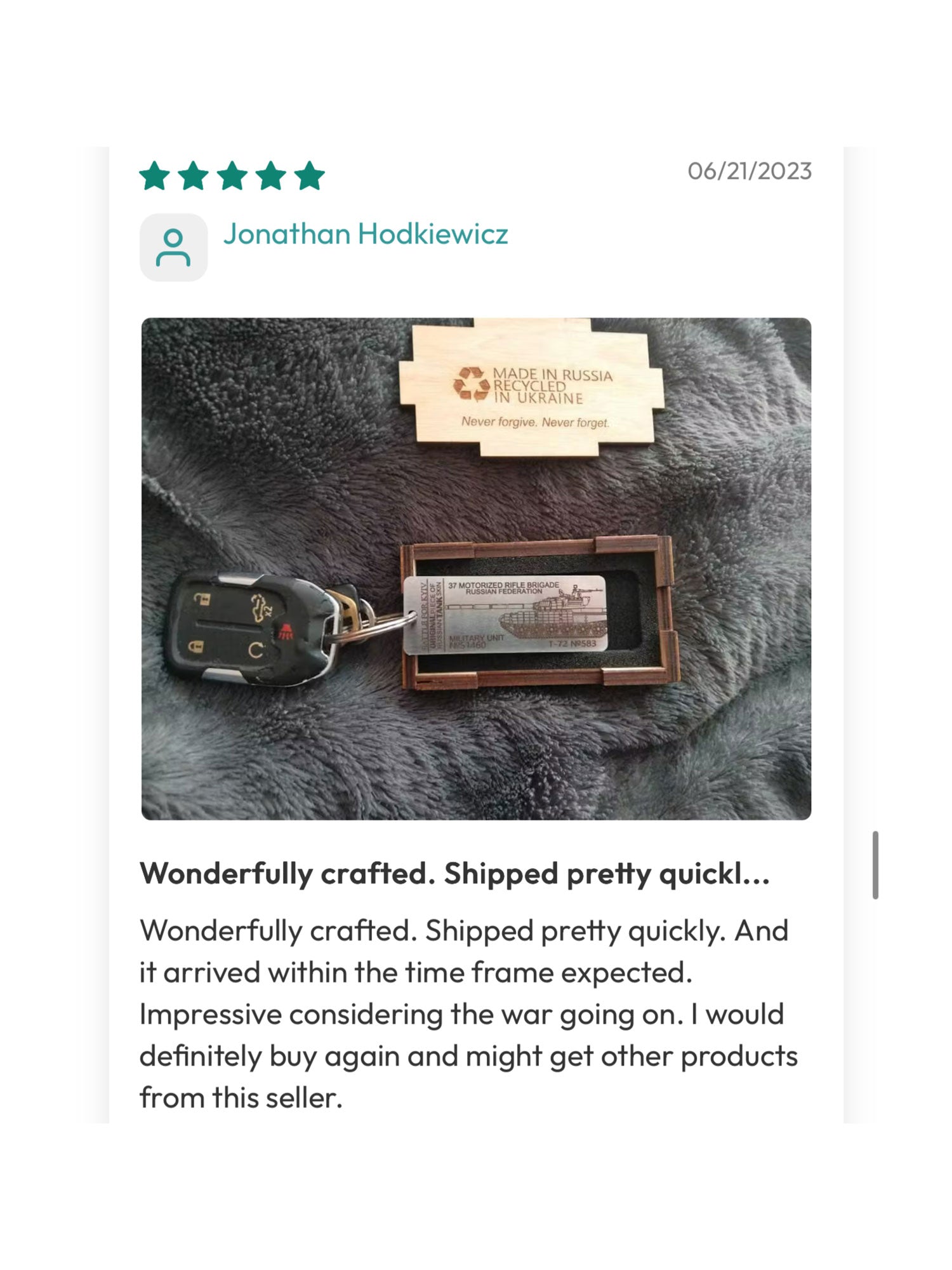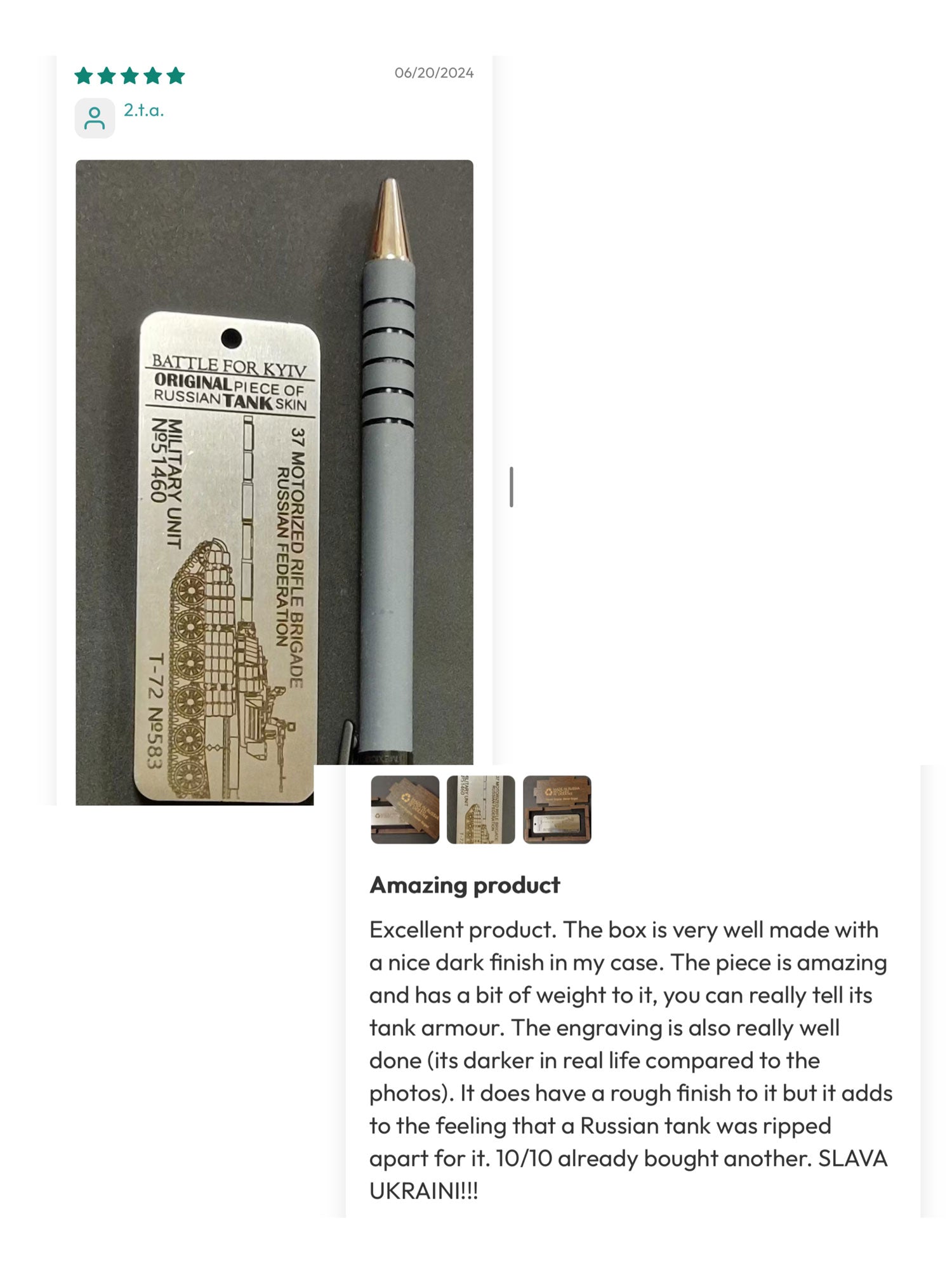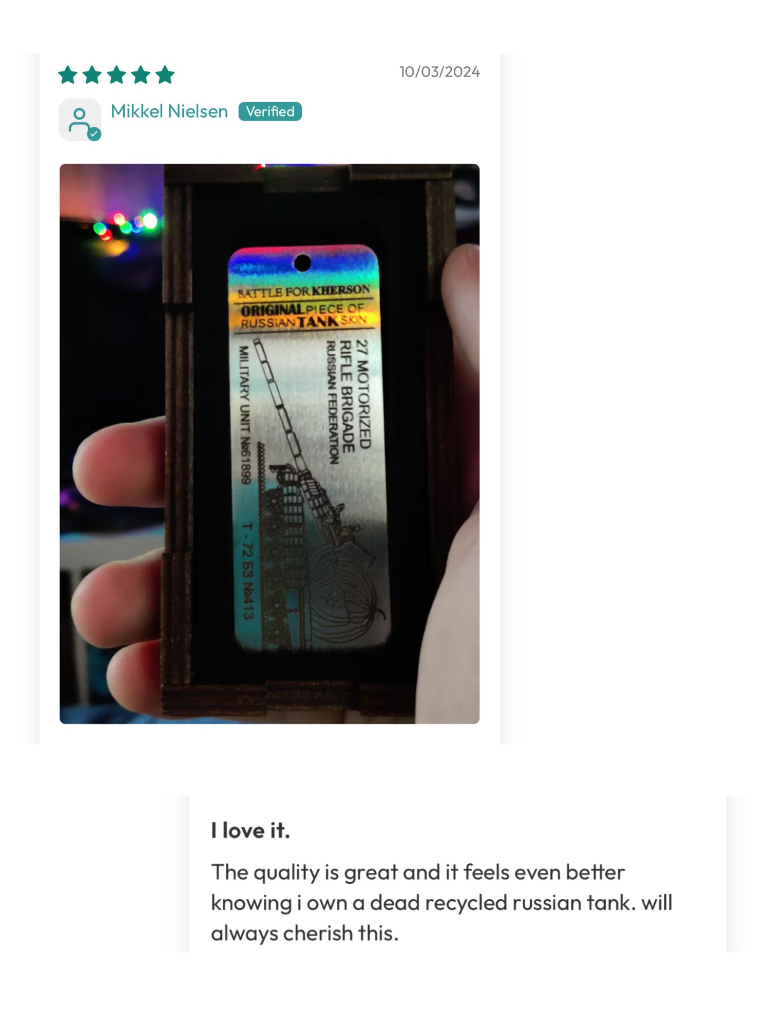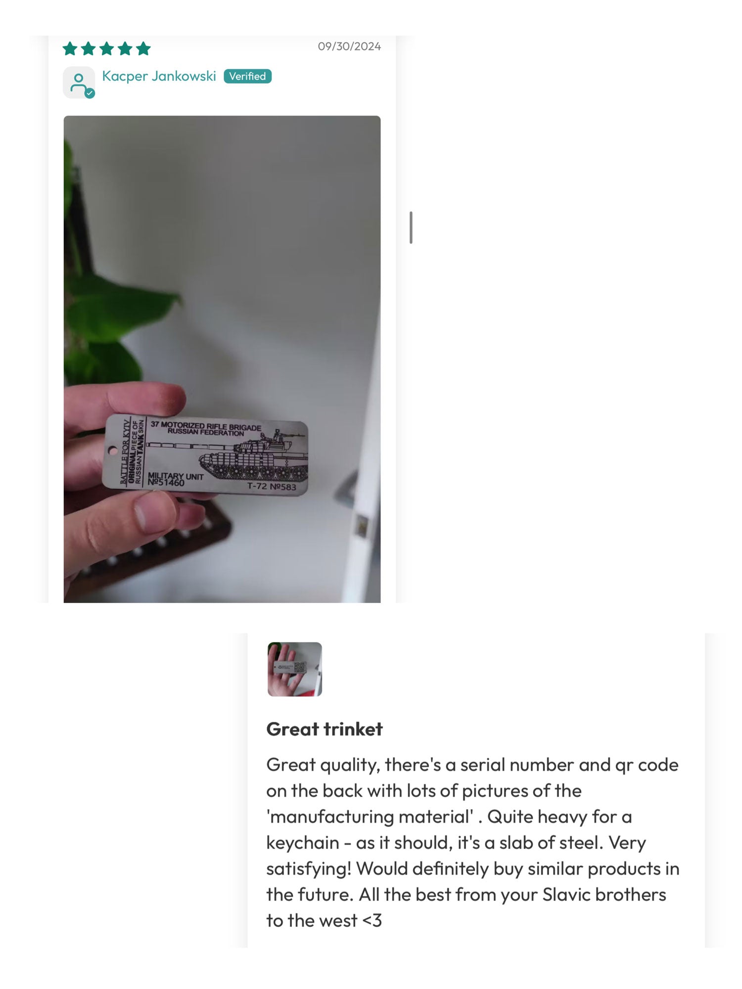 Our historical keychain has a limited quantity because it is made of a piece of Russian burned panzer armor, each keychain is engraved with the individual number of the keychain and a picture of a Russian tank. Because of armored steel's natural strength and durability, Our unique keychain will last a lifetime!