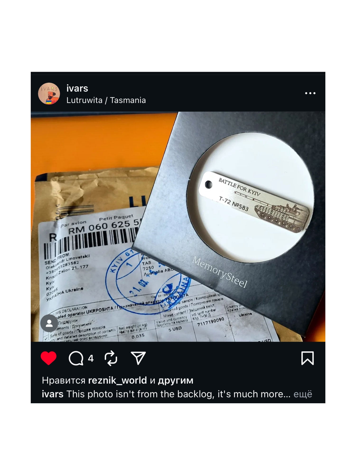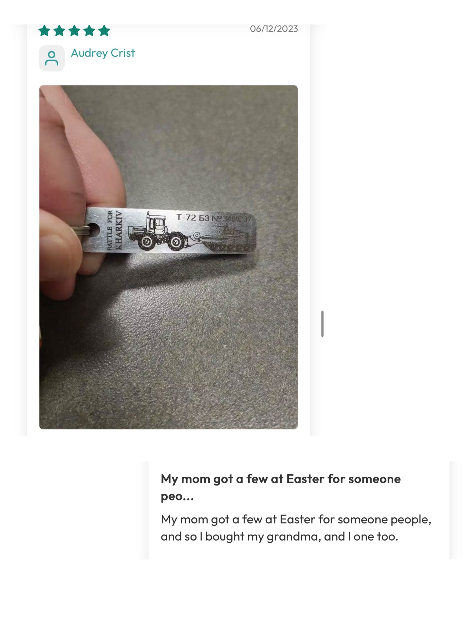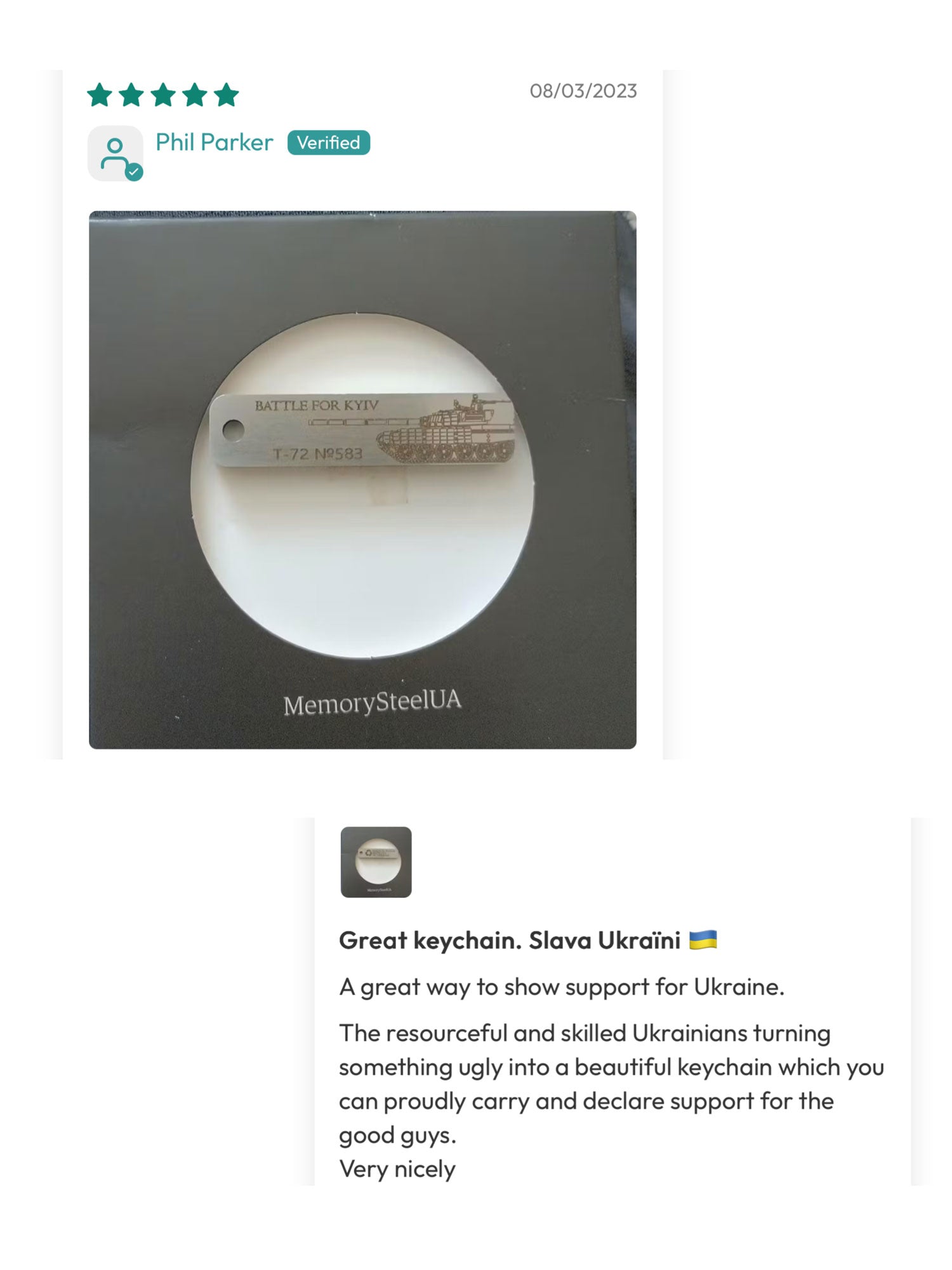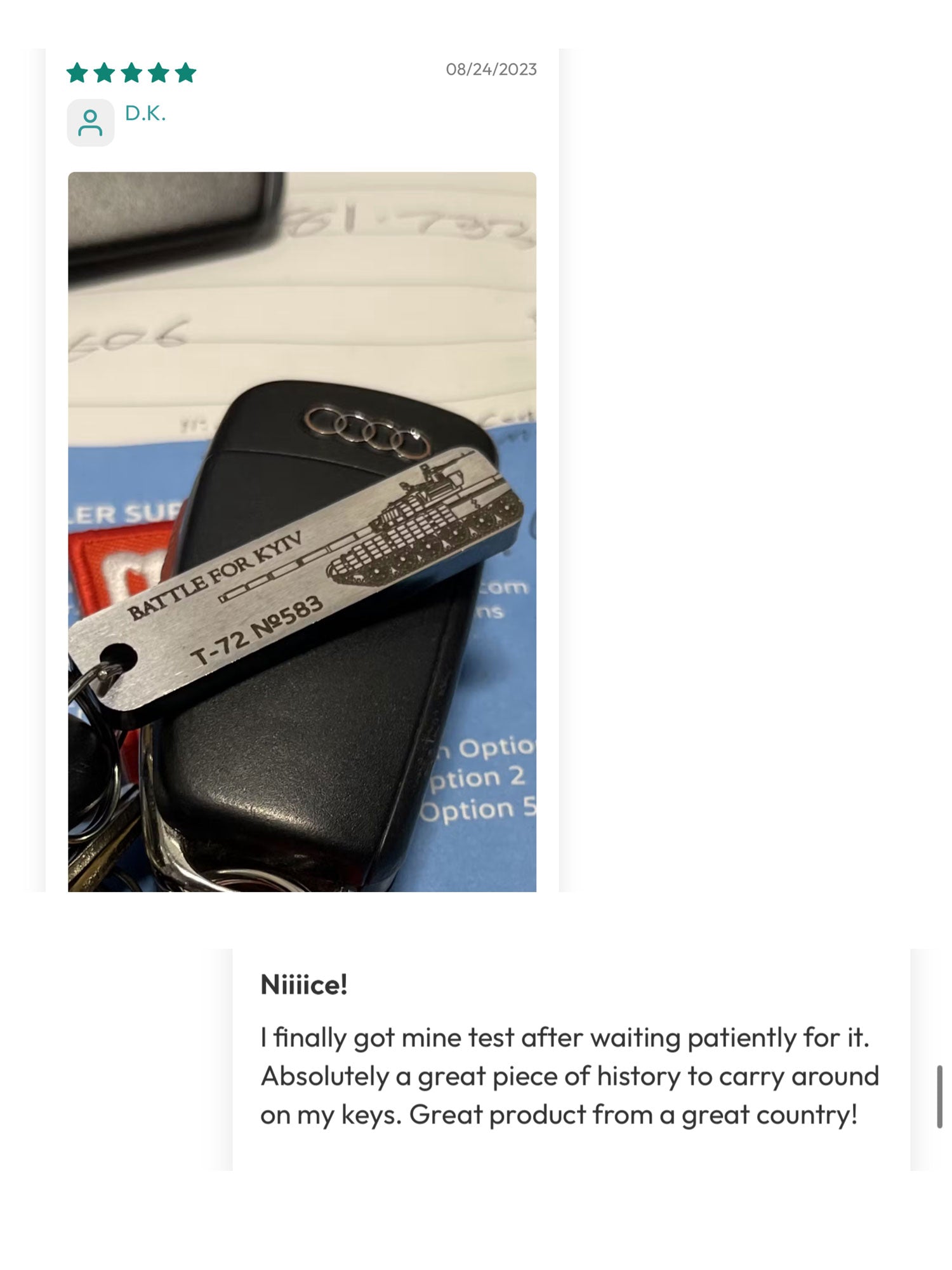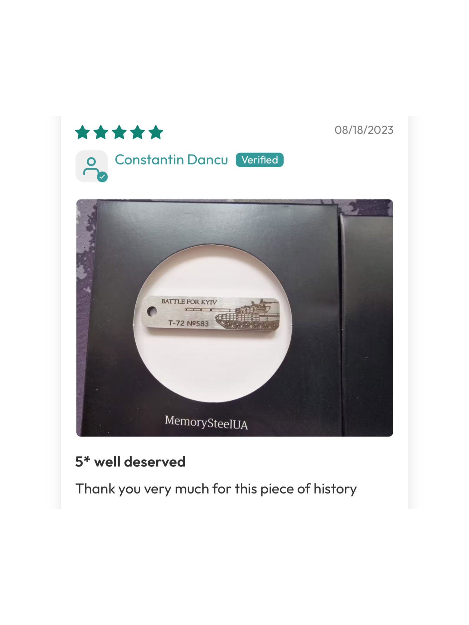 Brutal historical keychain has a limited quantity because it is made of a piece of russian burned tank armor. Because of armored steel's natural strength and durability, our unique keychain will last a lifetime! Do not recommend storing it in rooms with high humidity.